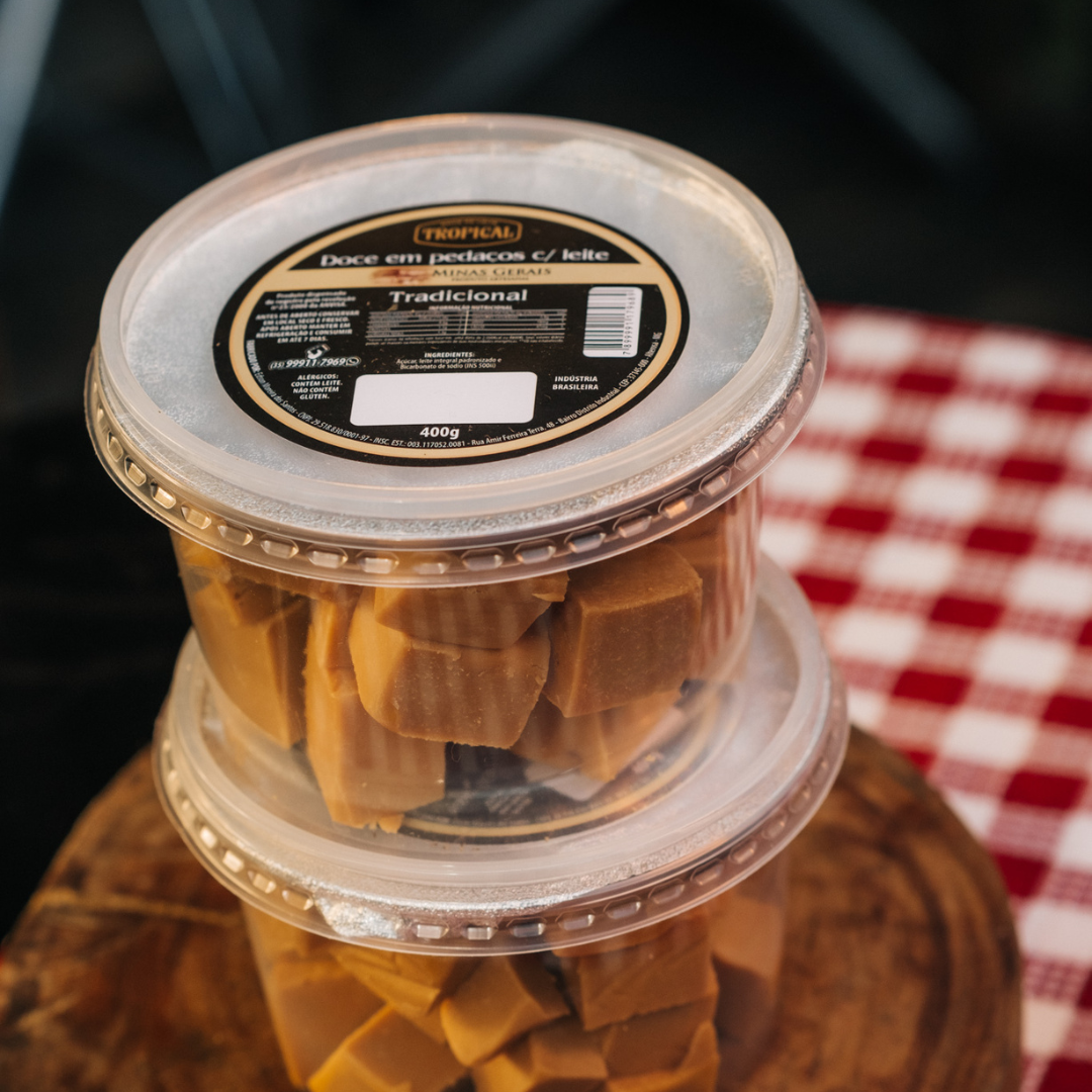 Nosso delicioso Doce de Leite Tropical está localizado na cidade de Alterosa - MG, situada ao sul do estado de Minas Gerais. Cada cubo desse doce é cuidadosamente produzido, garantindo a excelência e a qualidade que caracterizam essa especialidade. Feito de forma artesanal, esse doce de leite é elaborado com ingredientes selecionados e com todo o carinho que só um processo manual pode oferecer. Cada cubo é resultado de uma produção cuidadosa, proporcionando uma textura suave e um sabor marcante, típico dos melhores doces de leite artesanais. Este anúncio se refere a um pote de 400g de doce de leite tradcional em cubos.